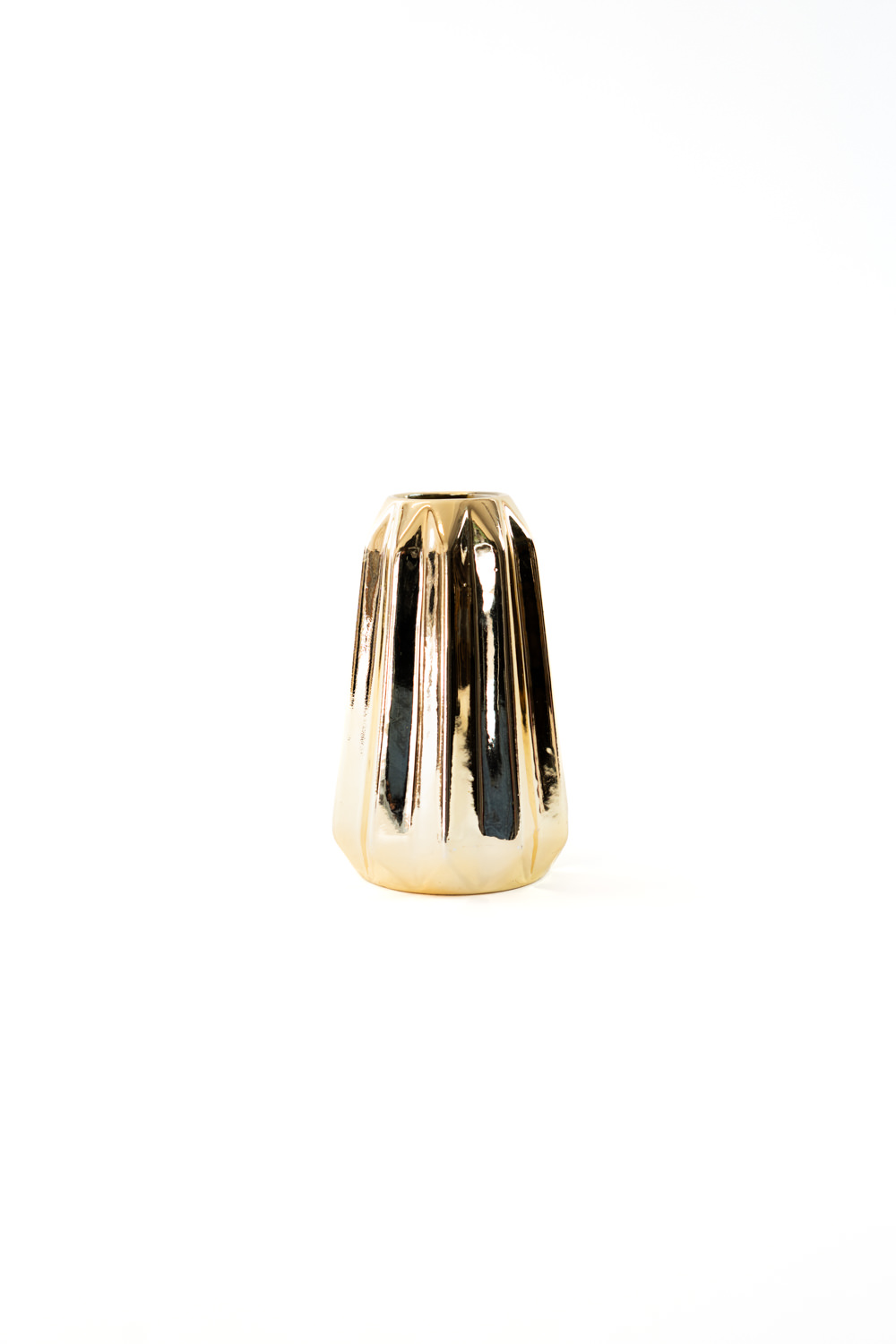 Keramická váza se zlatou glazurou – luxusní doplněk pro svatební výzdobu Tato elegantní keramická váza se zlatou glazurou je dokonalým prvkem pro luxusní svatební výzdobu. Zlatá glazura na keramickém povrchu dodává váze sofistikovaný a glamourní vzhled, který nádherně zvýrazní každé květinové aranžmá. Skvěle se hodí pro svatební kytice, traviny nebo sušené dekorace, ať už na svatební tabuli, sweet bar nebo v dekorativních koutcích.