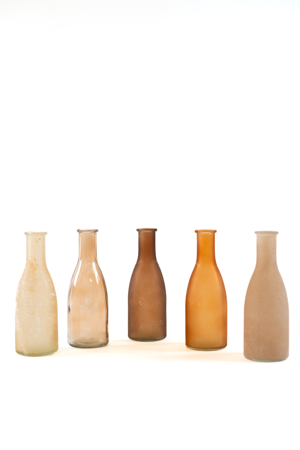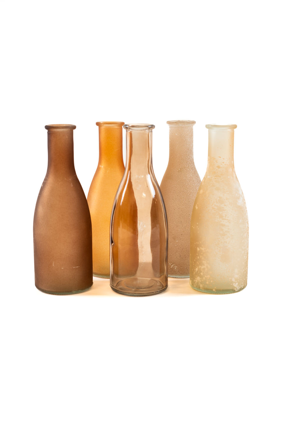 Tento jedinečný set 5 hnědých váziček ve tvaru lahviček přináší do svatební výzdoby osobitý a přírodní nádech. Každá vázička má jinou barvu, což zajišťuje zajímavý vizuální efekt a umožňuje snadné kombinování s různými květinovými aranžmá. Set je ideální pro menší kytice, traviny nebo sušené květiny a skvěle se hodí na svatební tabuli, sweet bar, obřadní stůl nebo dekorativní koutky.