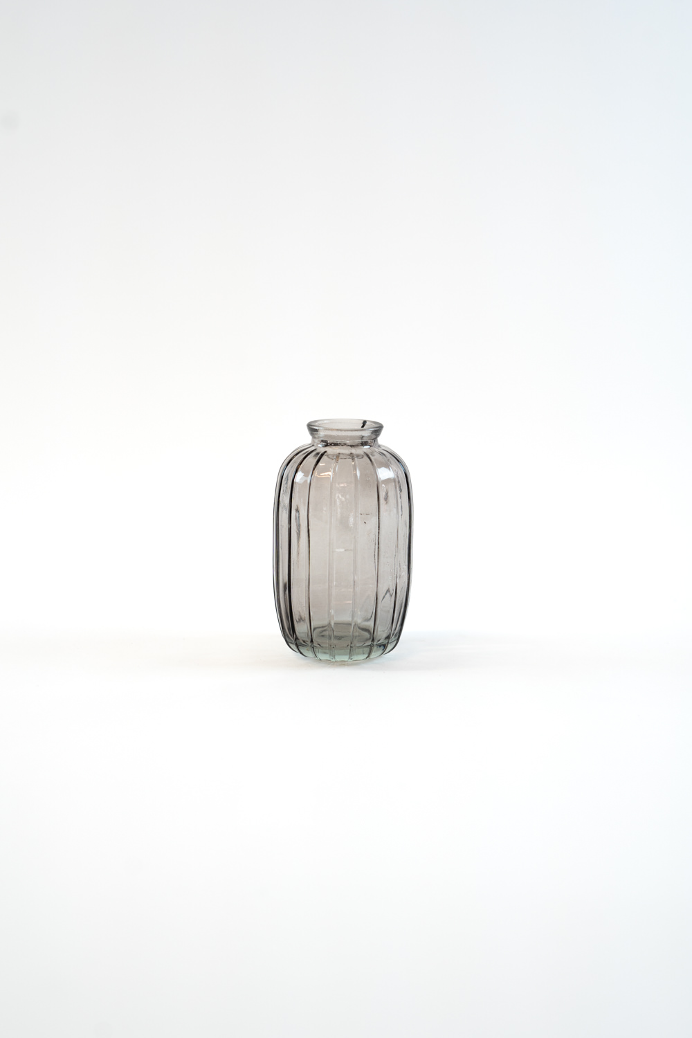 Tato šedá kouřová skleněná vázička s vroubky je perfektním doplňkem pro moderní svatební výzdobu. Díky svému kouřovému odstínu a texturovanému povrchu působí vázička sofistikovaně a zároveň elegantně. Je ideální pro drobné květiny, traviny nebo sušené aranžmá a skvěle vynikne na svatební tabuli, sweet bar nebo v dekorativních koutcích.